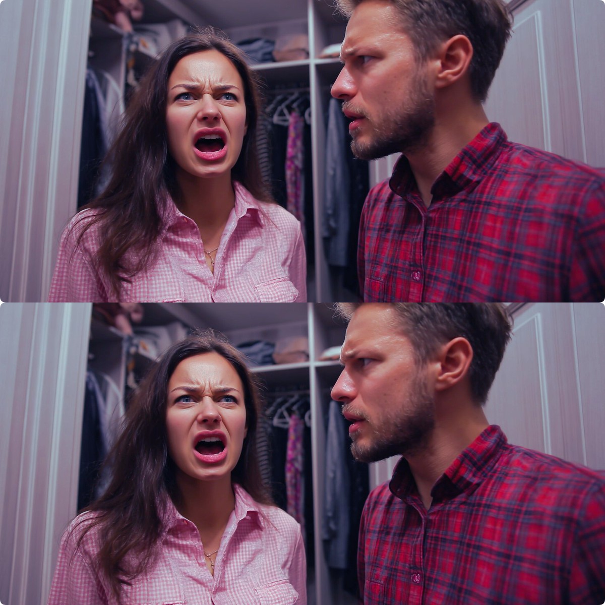 И тогда, в эту короткую паузу, растерянность на его лице сменилась чем-то другим. Маска любящего, слегка напуганного мужа треснула, и из-под неё проглянуло жёсткое, злое и расчётливое выражение. Он медленно выпрямился, чуть вздёрнув подбородок. Его голос, когда он заговорил снова, был уже другим — не лебезящим, а стальным, с ледяными нотками.