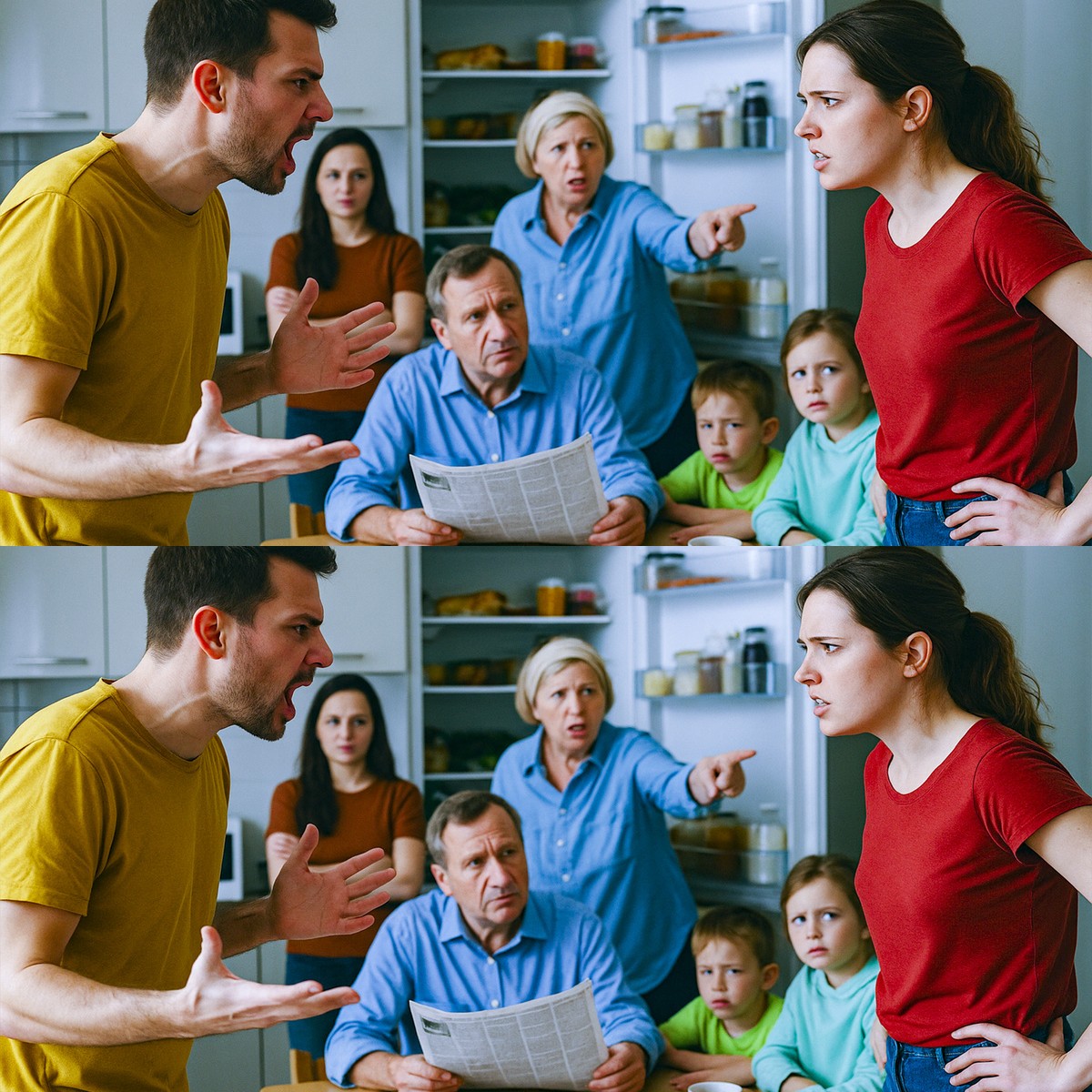 На кухне собралась вся семья. Валентина Петровна стояла у холодильника с открытой дверцей, Светлана сидела за столом с кислым лицом. Дети ныли, просили есть. Николай Иванович и Игорь молчали, но смотрели голодными глазами.