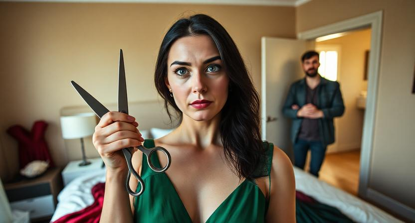Когда Игорь вошёл в квартиру, она уже закончила. Она стояла в спальне, держа ножницы, и смотрела на результат своей работы. Разрезанные платья лежали на кровати, как доказательства преступления.