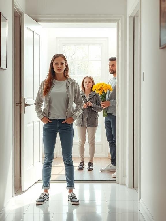На пороге стояла Тамара Аркадьевна — пуховик расстёгнут, в руках сумка, из которой торчал букет хризантем. Рядом — дядя Гена, высокий, немного сутулый, за ним — Владик с наушниками и Юлька в блестящей куртке.