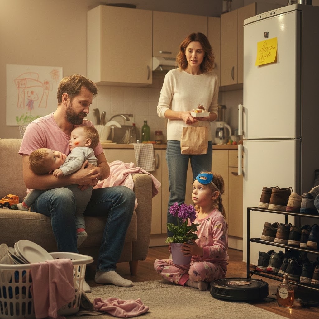 Он включил свет и ужаснулся. Квартира, которая еще в пятницу казалась уютным семейным гнездышком, теперь выглядела как декорация к фильму о постапокалипсисе. В углу сиротливо стоял заклинивший робот-пылесос, от которого всё еще несло элитным парфюмом. На ковре застыли пятна от пластилина, а в воздухе витал стойкий аромат пригоревшей каши и подгузников.