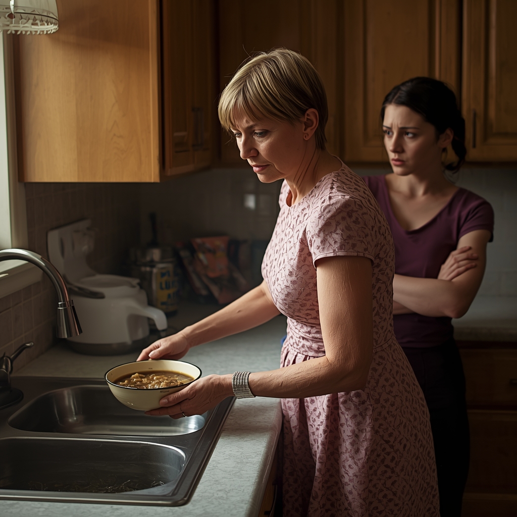 Она подошла к плите, взяла ложку, попробовала. Ее лицо не изменилось. Затем она спокойно взяла кастрюлю, поднесла к раковине и вылила суп, весь, до дна.