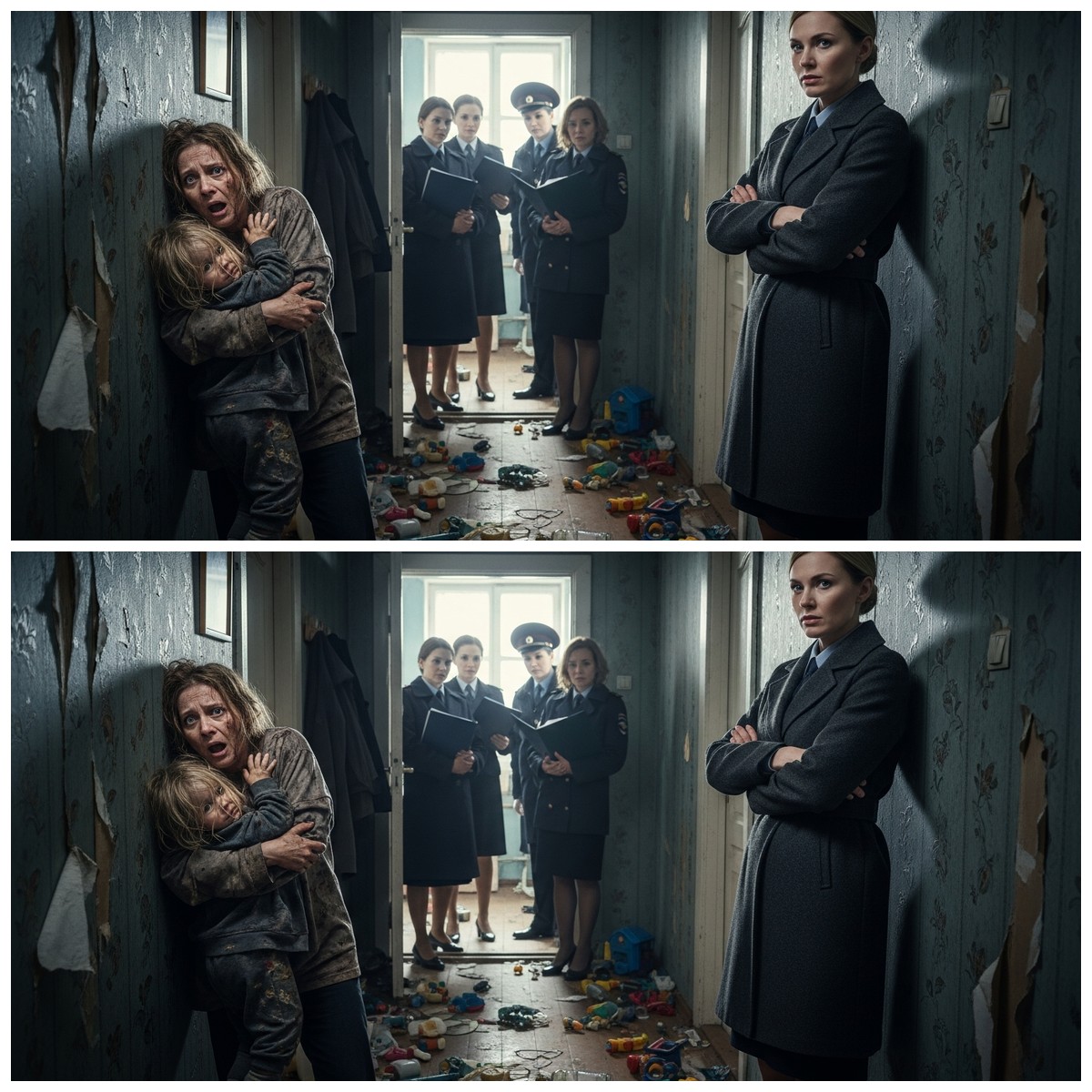 — Это не собственность, это притон, — холодно отрезала инспектор. — Почему дети не в школе? Старшему семь лет, должен быть на уроках. Почему младший в грязной майке? Почему в холодильнике… — она открыла холодильник, — …мышь повесилась? Одно пиво и майонез? Где горячее питание?