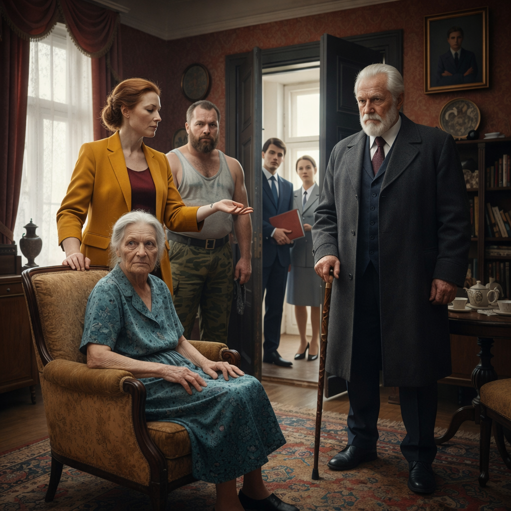 Перед ней высился Борис Яковлевич Гольдман. В свои восемьдесят пять он выглядел как оживший портрет старой аристократии: кашемировое пальто, идеально выглаженное кашне и тяжелая трость с набалдашником в виде головы льва. За его спиной стояли трое: молодой человек в строгом костюме с кожаной папкой, женщина с суровым лицом в форме социального работника и хмурый мужчина, в котором безошибочно угадывался участковый.