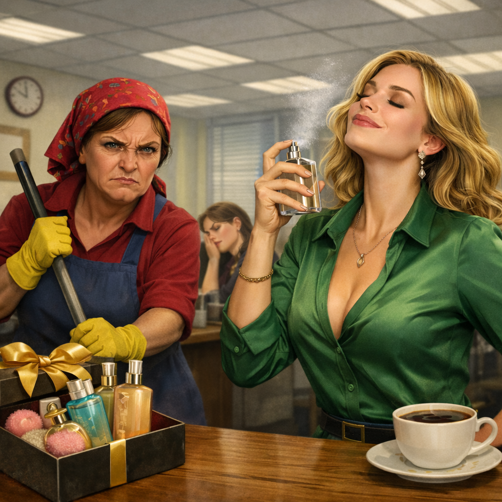 Вероника, наша «звезда» отдела, застыла у своего стола, медленно поворачивая голову в сторону женщины со шваброй.