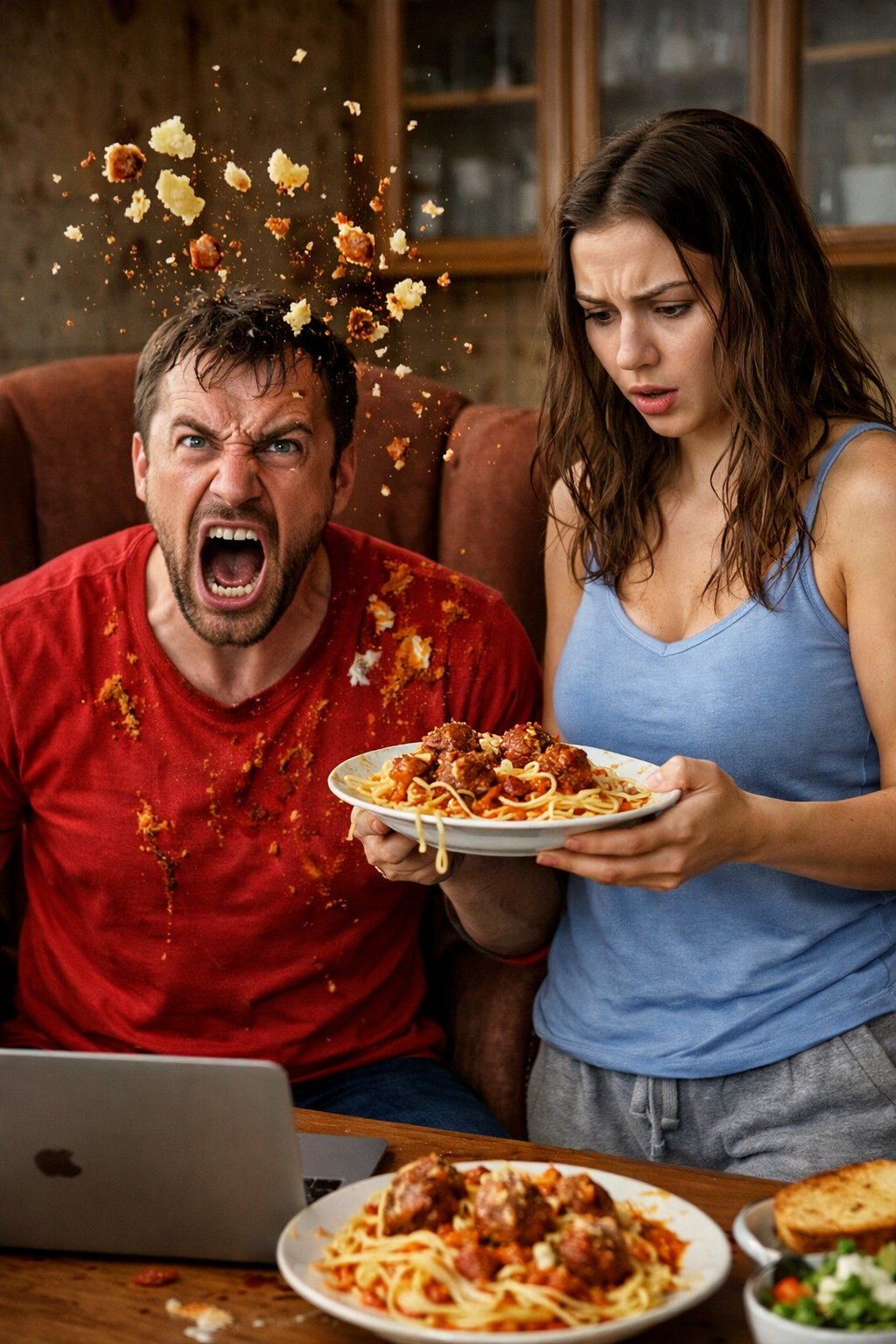 И в этот момент она опрокинула ему на макушку всё содержимое. Мясо с подливкой, картофельное пюре – всё это тяжёлой массой шлёпнулось ему на голову, потекло по волосам, за воротник, на клавиатуру. Дмитрий вскочил, заорал матом, пытаясь стряхнуть с себя горячую жижу. Ноутбук упал на пол, экран погас.