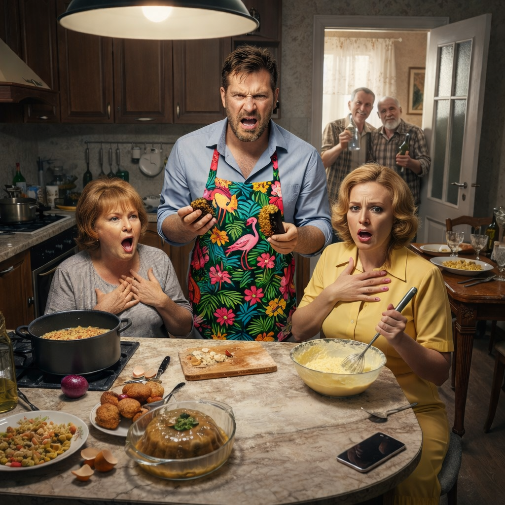 Ситуация накалялась. К часу дня кухня напоминала декорации к фильму о природной катастрофе. Света, всё-таки решившись нарезать салат, перепутала банки и бухнула в «Мимозу» вместо консервированной горбуши шпроты в масле. Заливное, которое Клавдия Петровна пыталась соорудить лично, наотрез отказалось застывать. Жидкость упрямо колыхалась в глубоком блюде, а внутри сиротливо плавали куски судака и морковные звезды, больше похожие на обломки кораблекрушения.