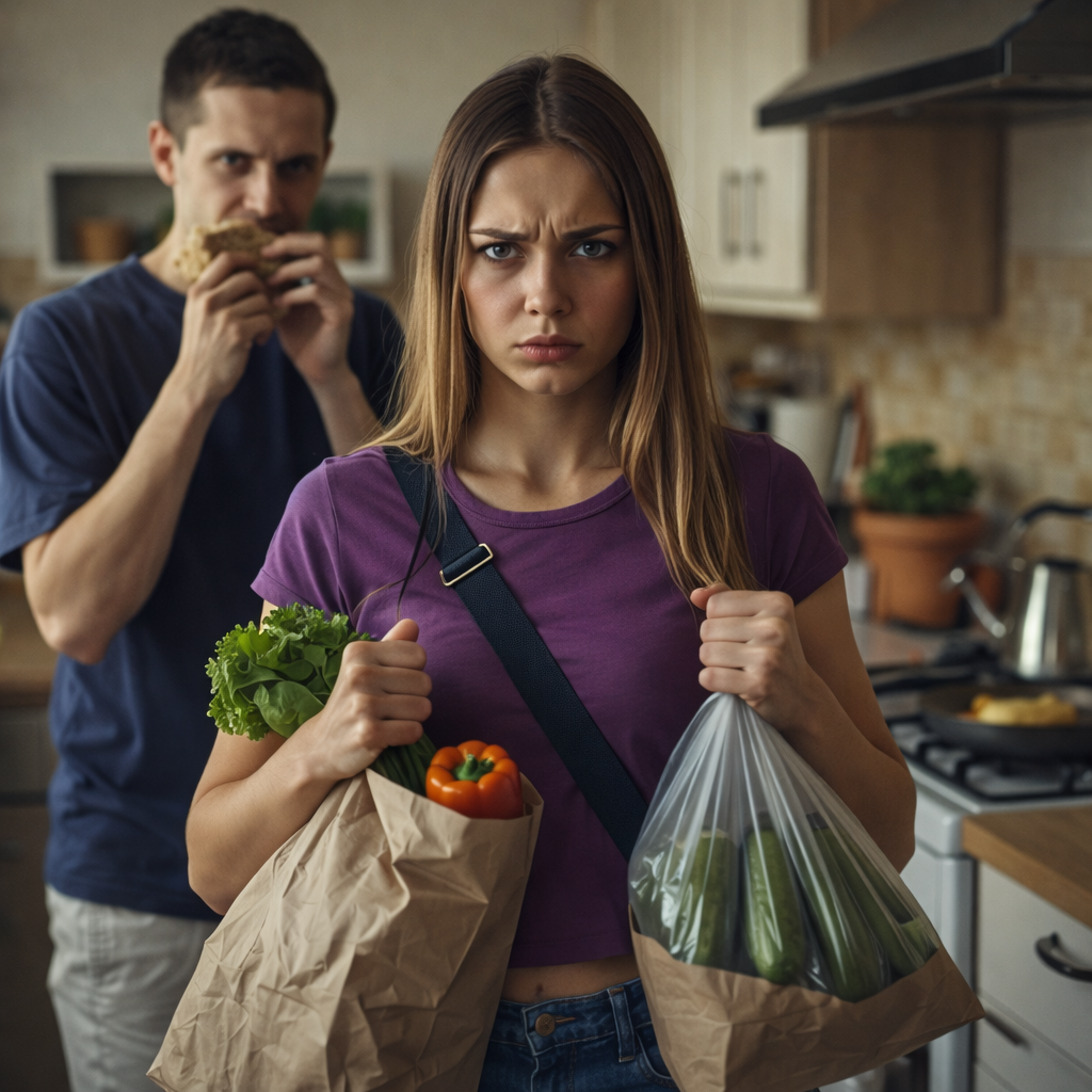 Алина поставила пакеты на пол. Медленно разулась. Из кухни вышел Дима, красный, довольный, с бутербродом в руке.
